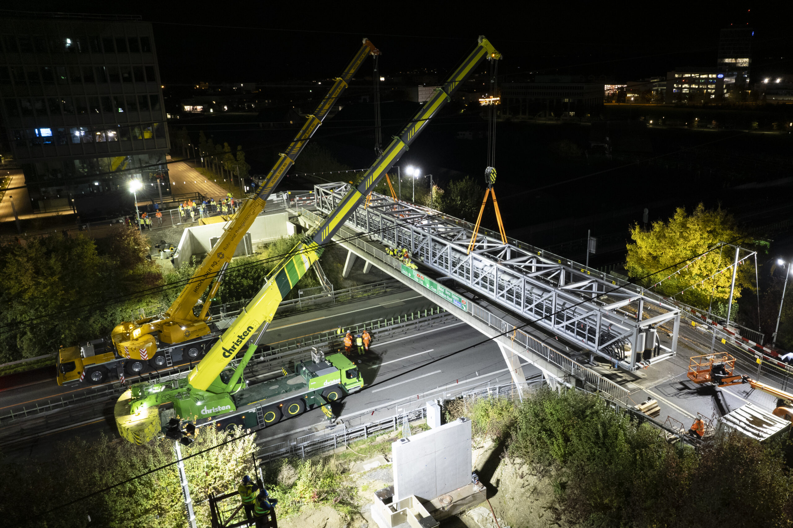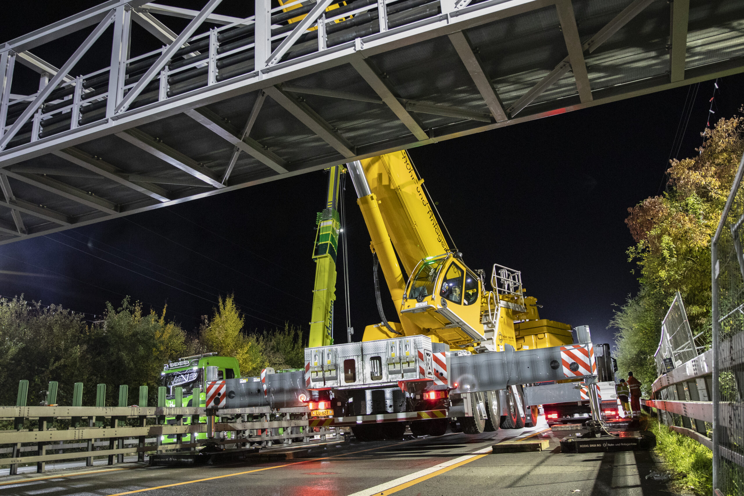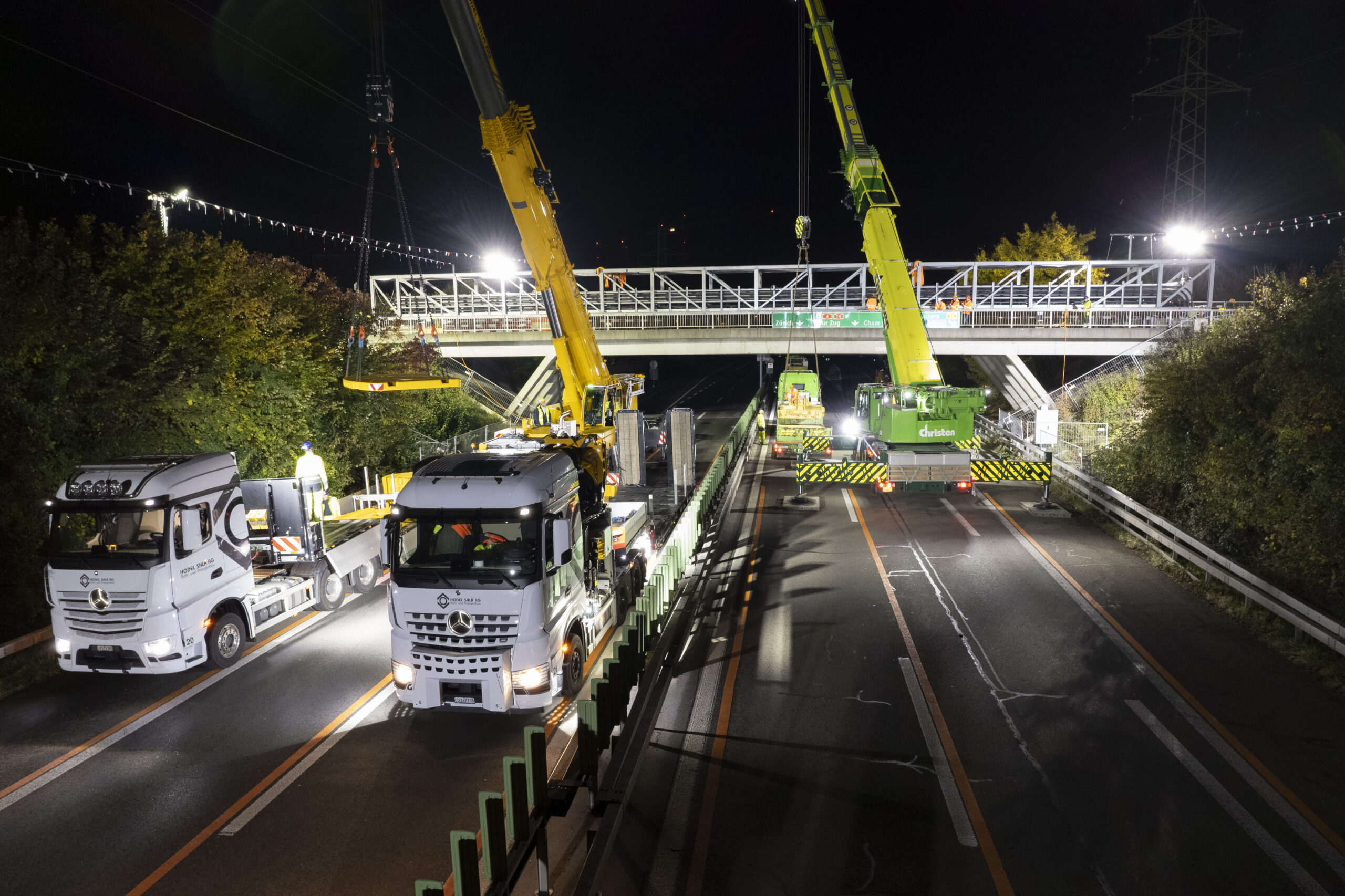 Die einzelnen Elemente wurden in der eigenen Werkhalle vorgefertigt und im Rahmen eines Probehubs präzise auf die Einbausituation abgestimmt. Transport und Montage erfolgten in mehreren Etappen. Das finale Einheben der Rohrbrücke wurde während einer Vollsperrung der Autobahn exakt umgesetzt.