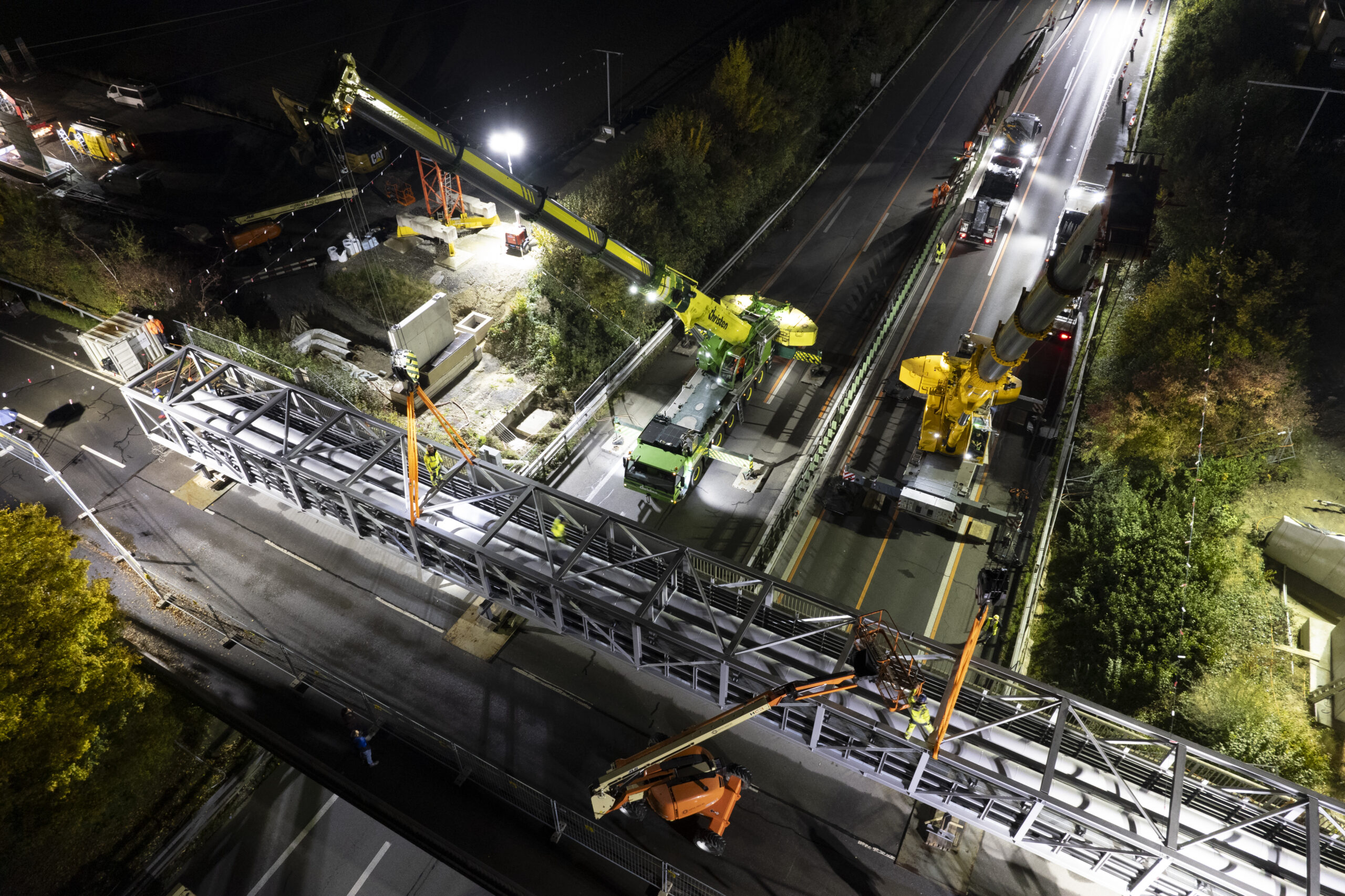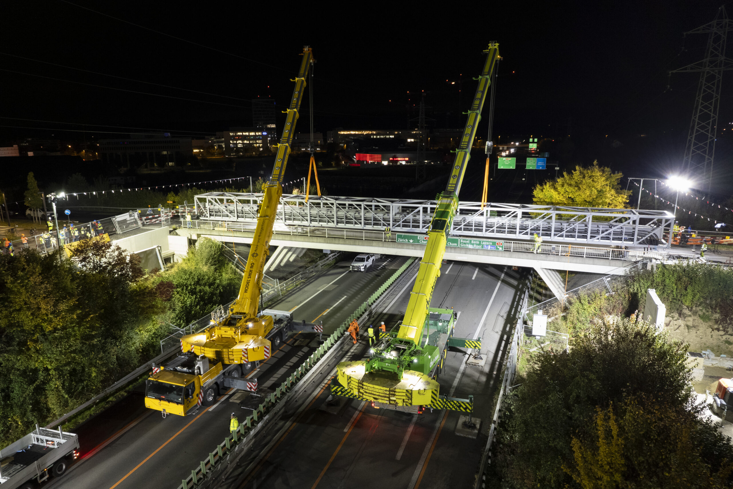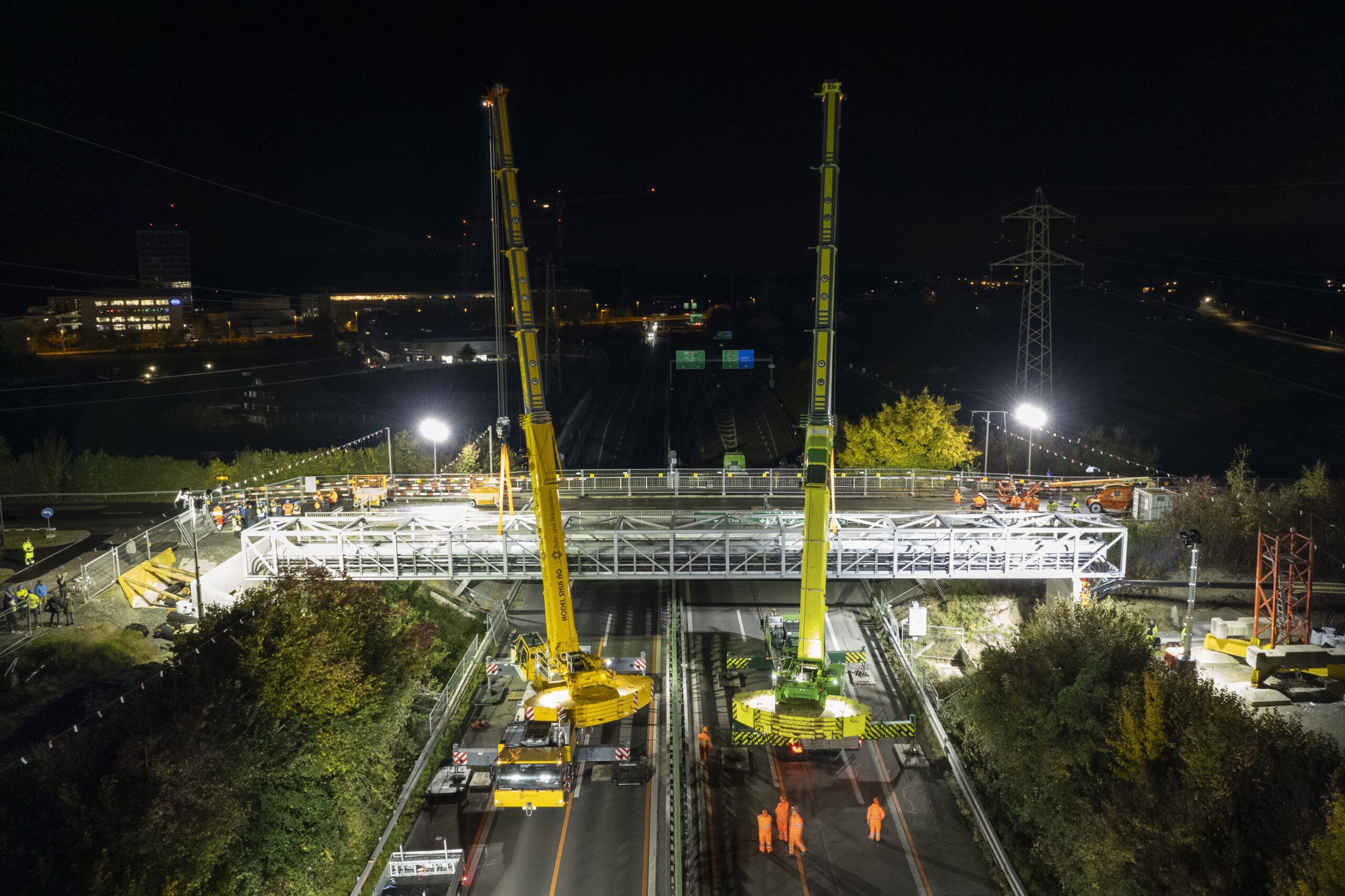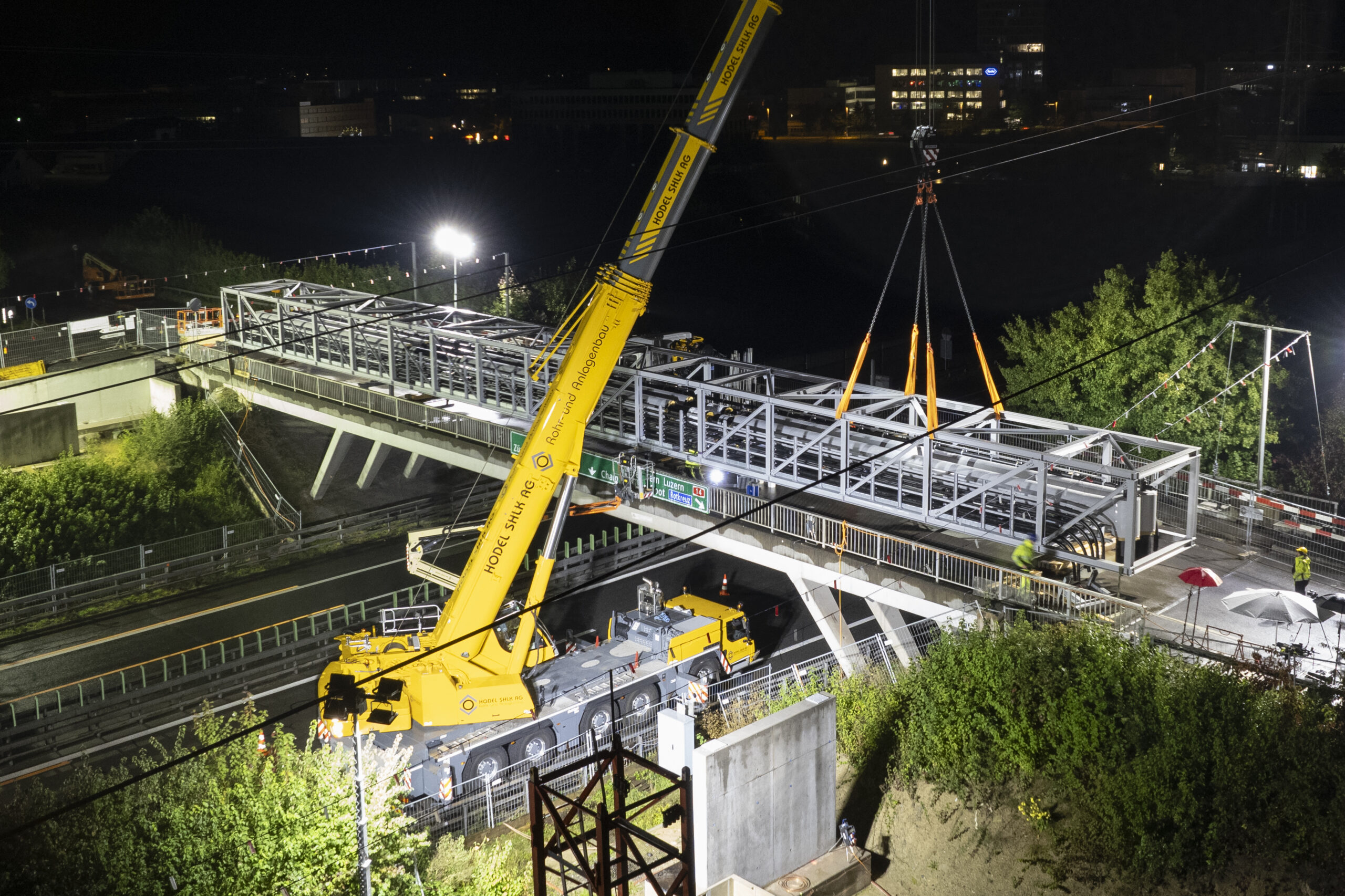 Die einzelnen Elemente wurden in der eigenen Werkhalle vorgefertigt und im Rahmen eines Probehubs präzise auf die Einbausituation abgestimmt. Transport und Montage erfolgten in mehreren Etappen. Das finale Einheben der Rohrbrücke wurde während einer Vollsperrung der Autobahn exakt umgesetzt.