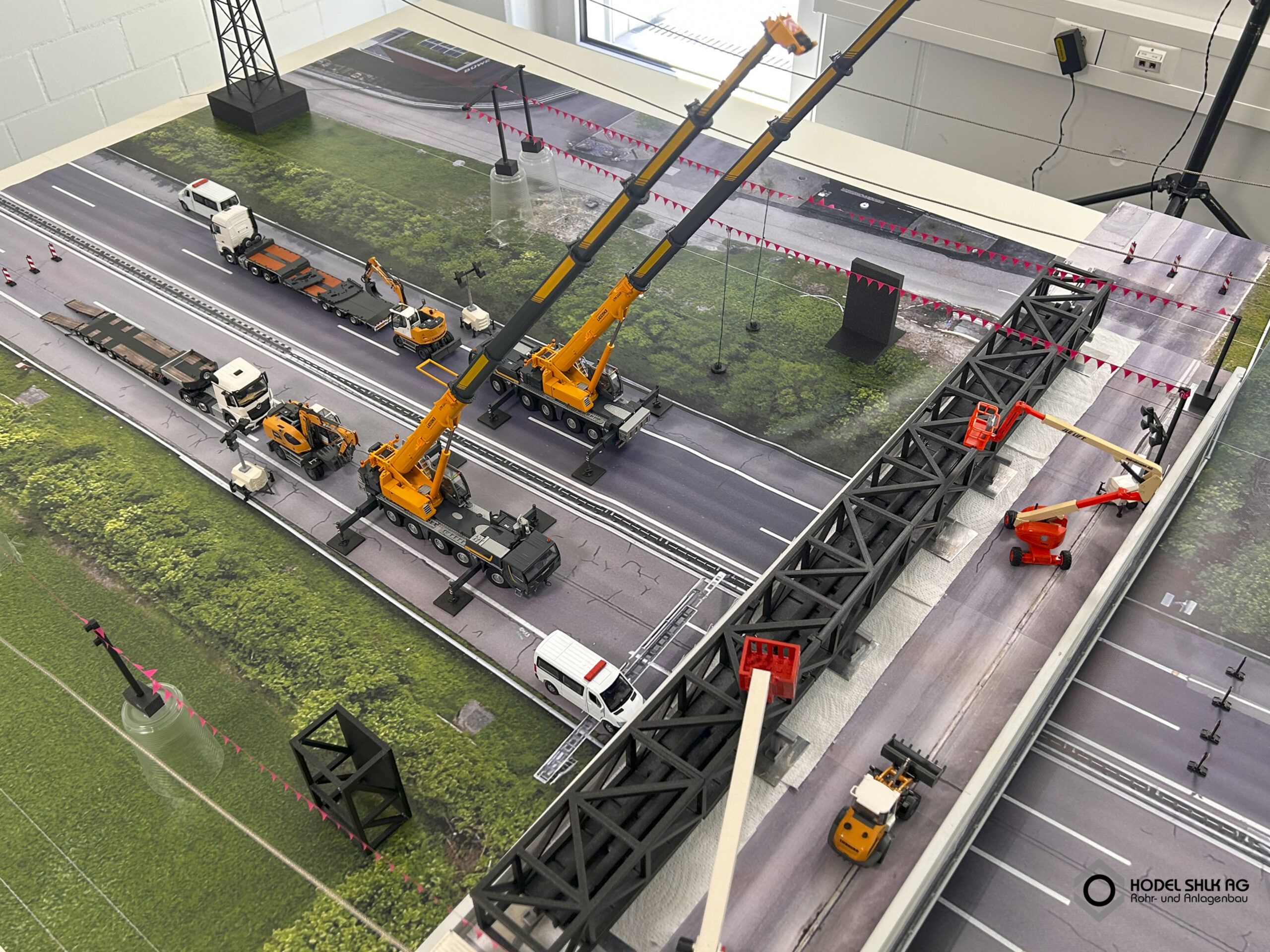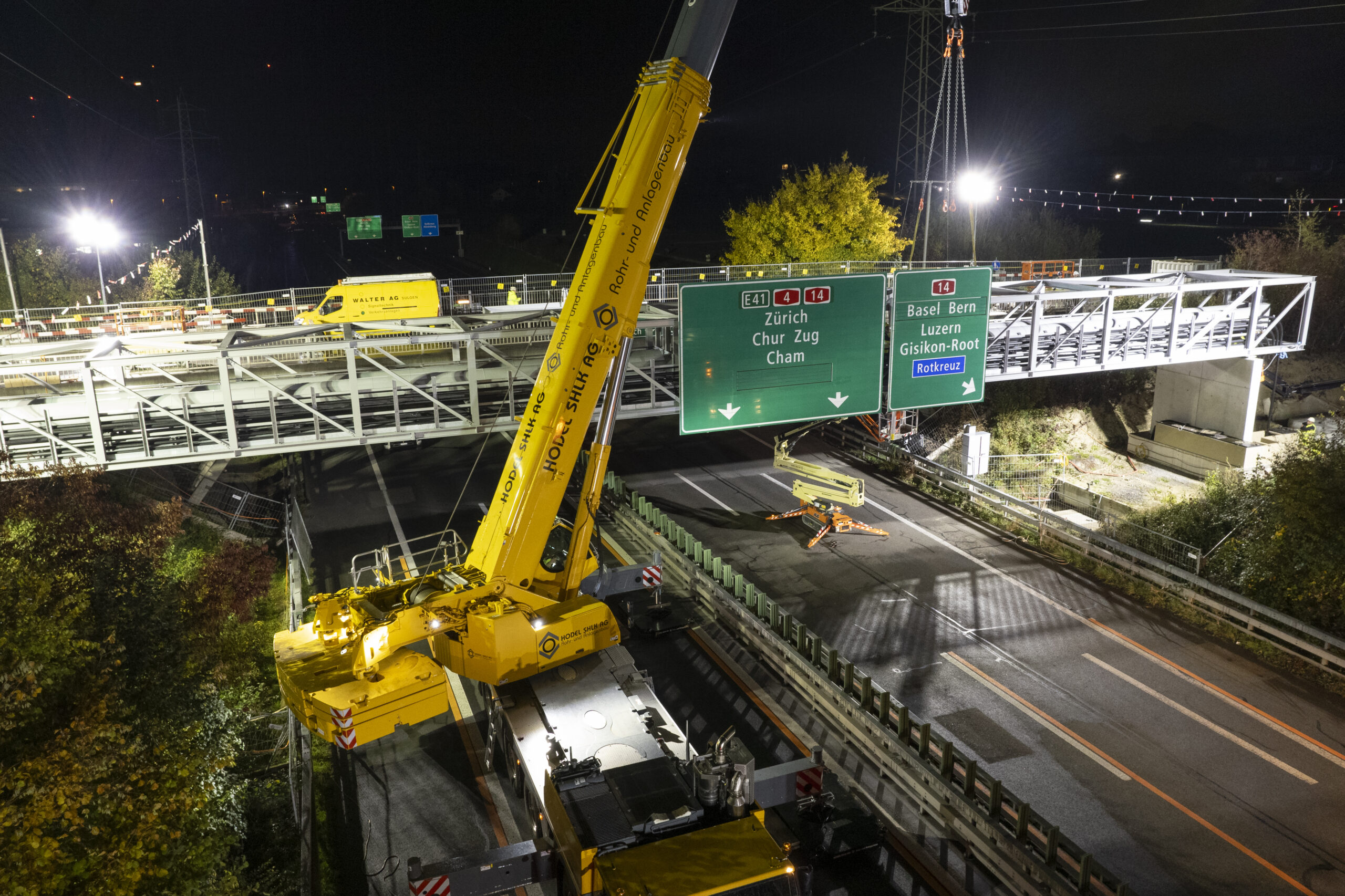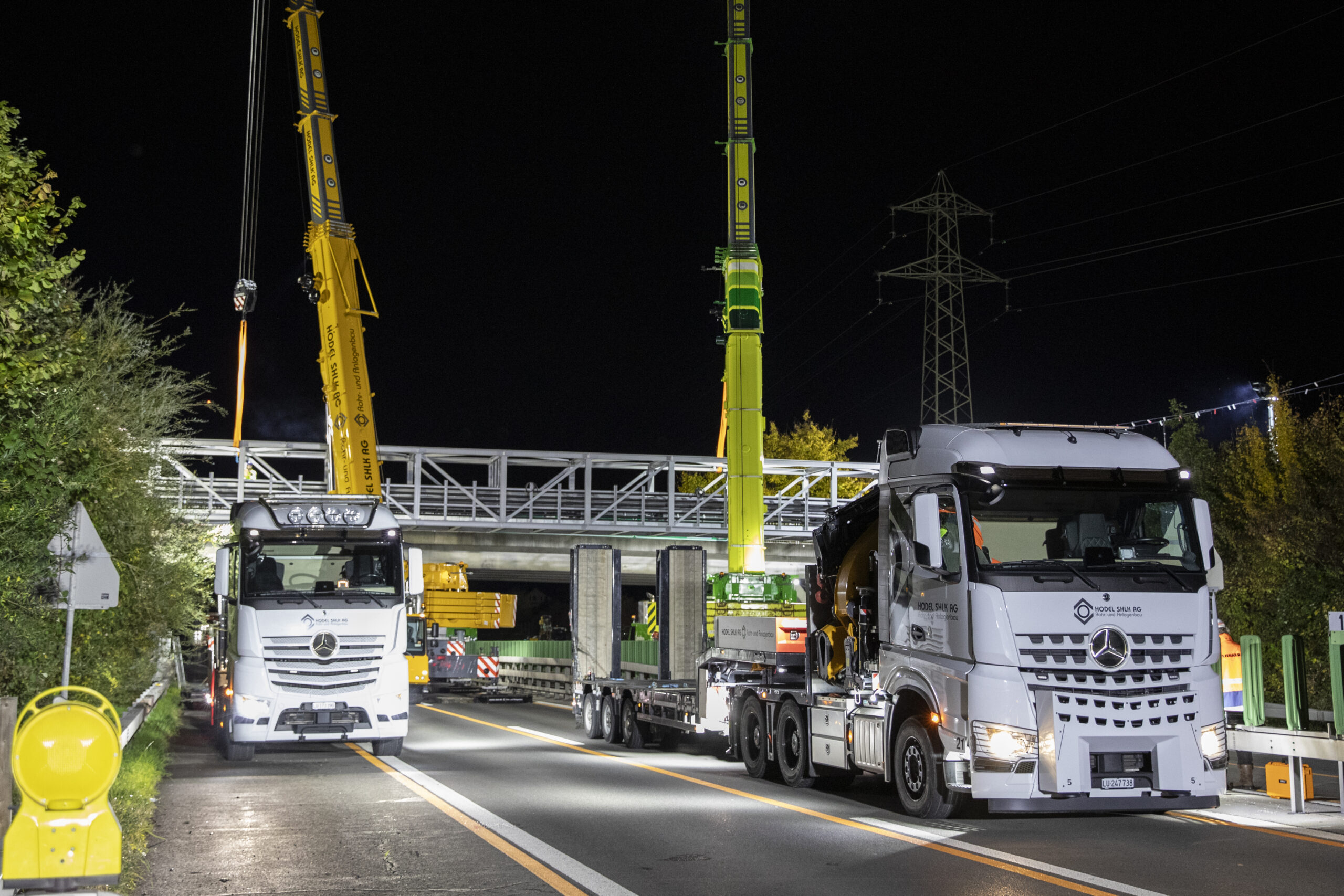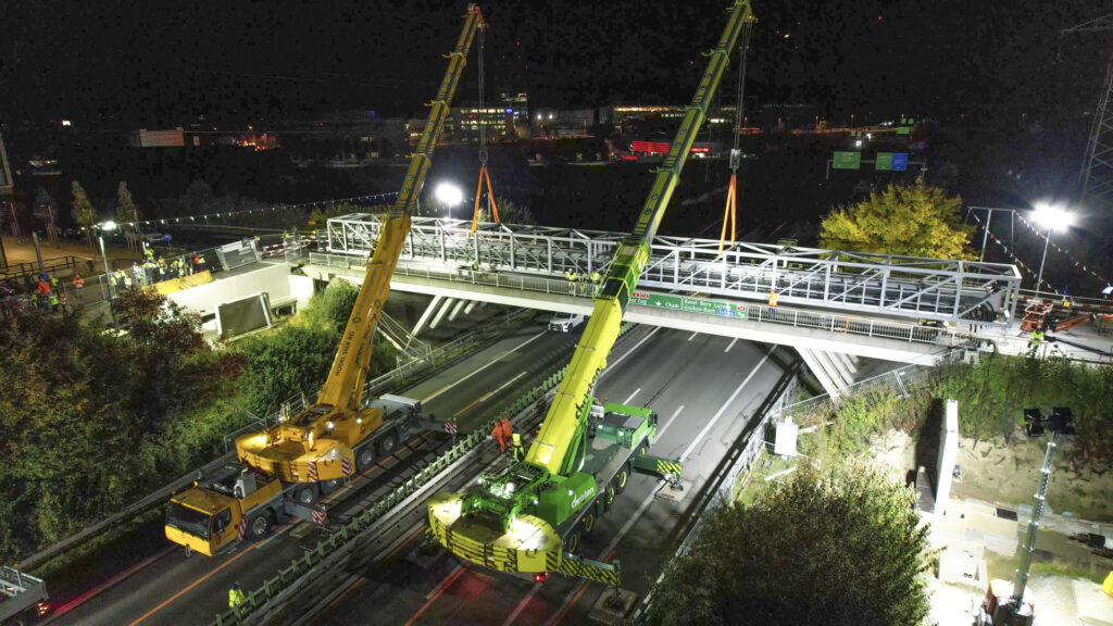 Die einzelnen Elemente wurden in der eigenen Werkhalle vorgefertigt und im Rahmen eines Probehubs präzise auf die Einbausituation abgestimmt. Transport und Montage erfolgten in mehreren Etappen. Das finale Einheben der Rohrbrücke wurde während einer Vollsperrung der Autobahn exakt umgesetzt.