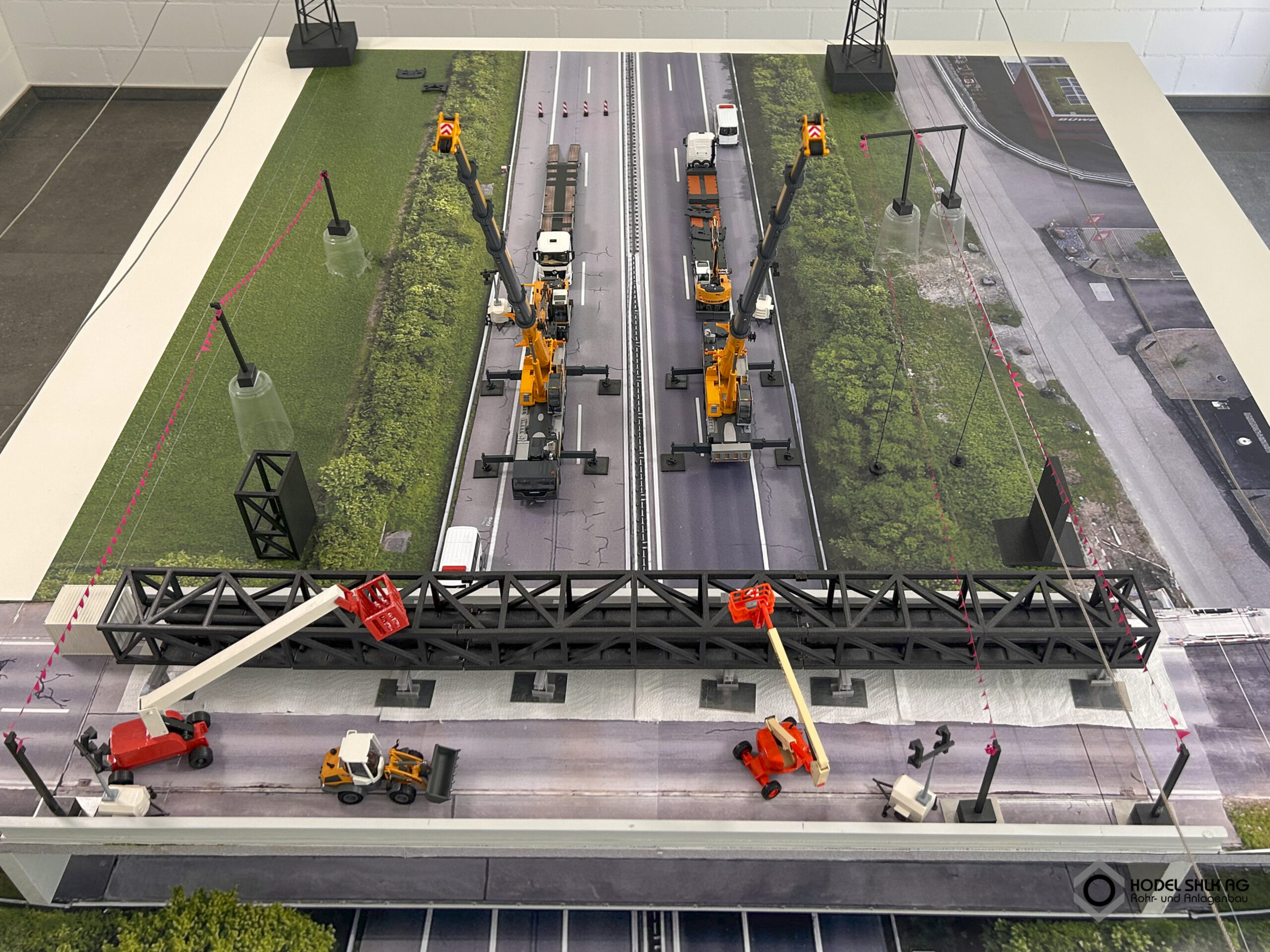 Montage über einer stark frequentierten Autobahn unter laufendem Verkehr